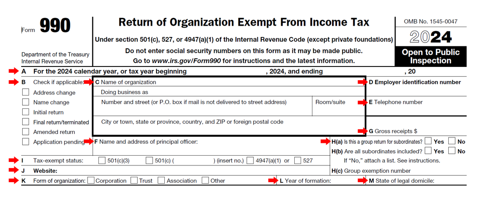 An item-by-item review of the core identifying information required in the Form 990 heading