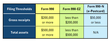 - Form 990: Typically required for organizations with gross receipts of $200,000 or more, or total assets of $500,000 or more.